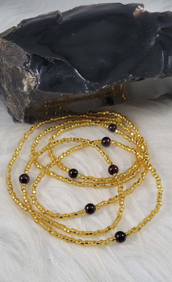 Hand CraftedGold waistbeads made with natural Garnet incorporated throughout